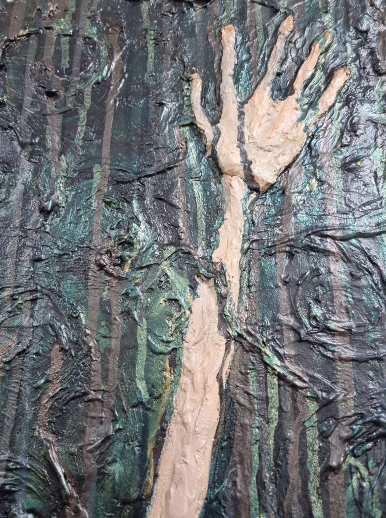 This is the largest of all my pieces. She stands lifesize. She is that wild child still, caught in the storm and reaching for your hand. The void is around her, but it is less significant now. She stands tall and holds out her hand as if to ask for a hand up. If you were to stand beside this painting and look down upon it, you would see the child she is and you would feel compelled to take her tiny, skinny little hand. Her head is overlarge and stuffed with thoughts, like a young child, she is yet to grow into the size of it.