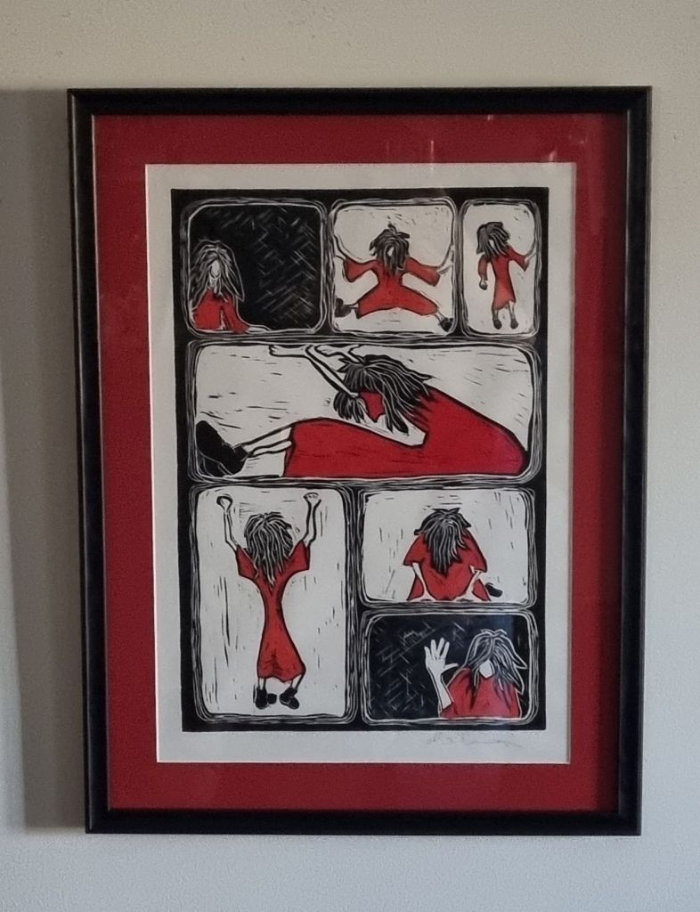 So this piece is all about that struggle. It’s about feeling locked in and wanting to break out. I don’t know how many of you remember a band called A-HA and the video they did of a song called, “Take on me” but there is a part where the guy in the comic book is trying to break free of the page he is on and that is what I think of everytime I look at this piece. I drew it as comic book cells and each one is a different part of the struggle that is happening. Again, the noise of the lino block printing method helps to add to the movement and tension of the piece. The simplicity of the figures makes you examine the poses more closely and the grouping of the cells together as a singular page is intended to reveal the often conflicting nature of the struggle.