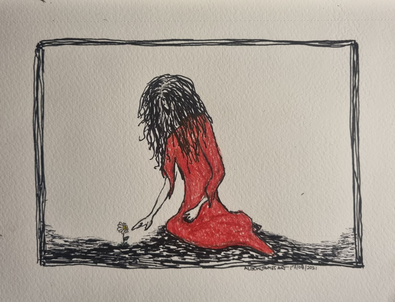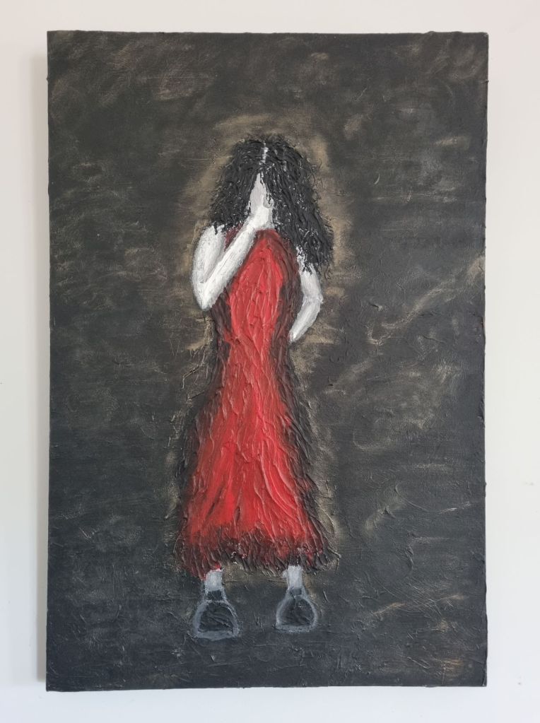 A lot of the work is naive in style. I wanted it to be simple for the most part, like a child had done it. In a lot of ways, a child DID I guess. The palette is basic. It is overrulingly red, white and black. Everything else is overwhelmed by those colours as they often were in my mental mindscape. You will notice as I release descriptions of each of the pieces that I don’t stick to any one type of media. It doesn’t suit me and it certainly didn’t suit my mental state. I found that when I was stuck in my creative practice, the best thing I could do was switch it up and try something else. So each of the pieces I have put out there is in the medium I chose that felt the most, “right” for what I was doing.