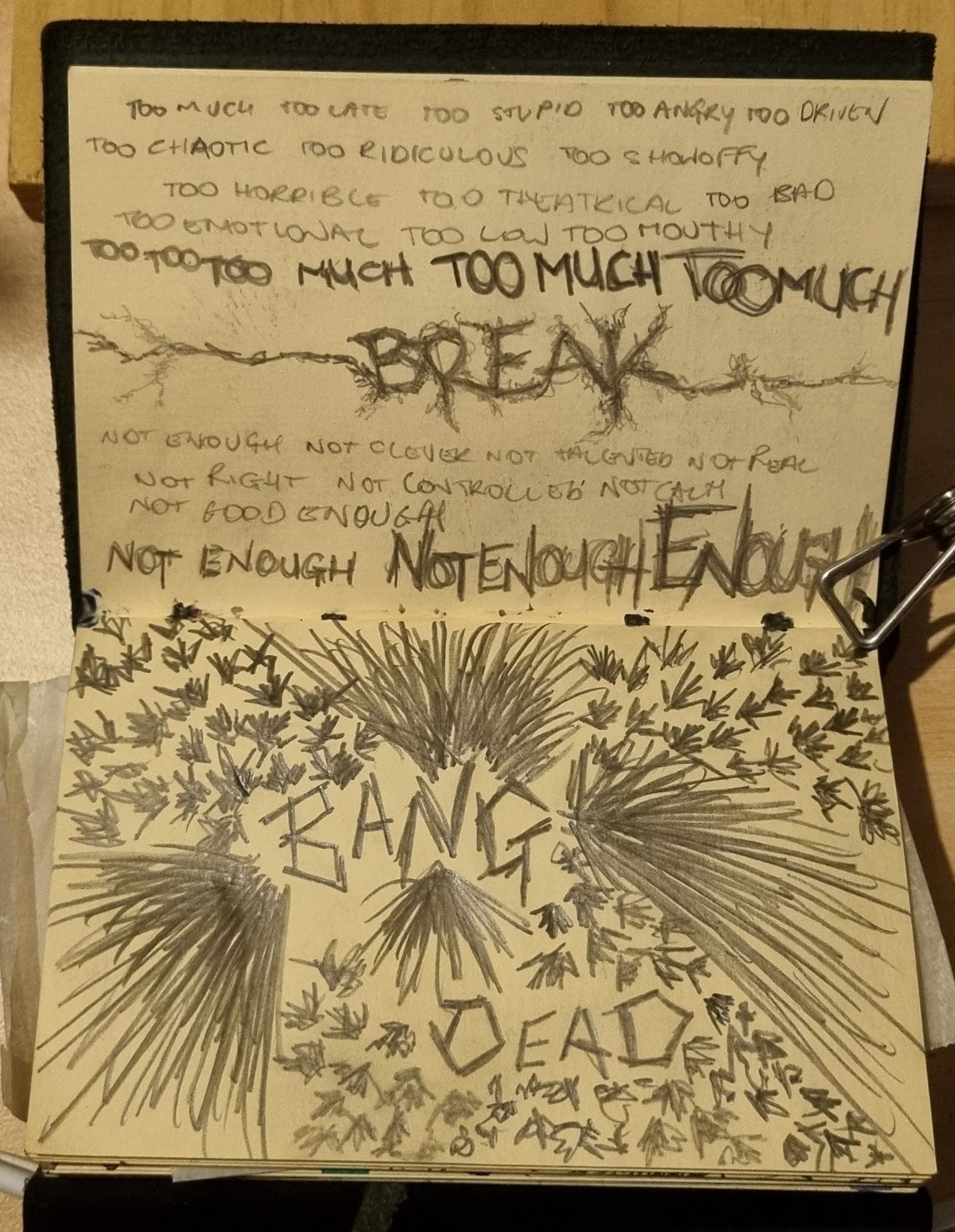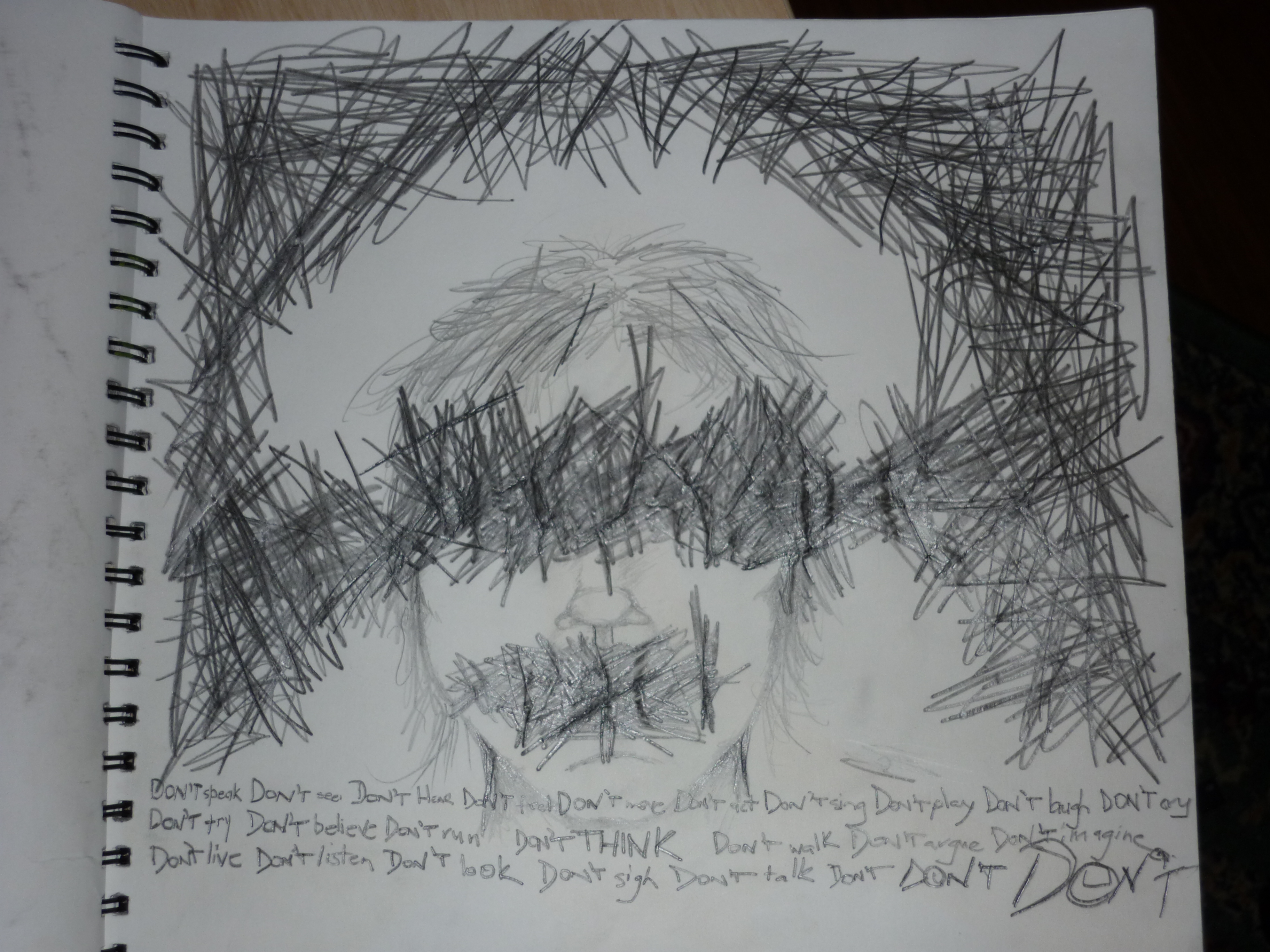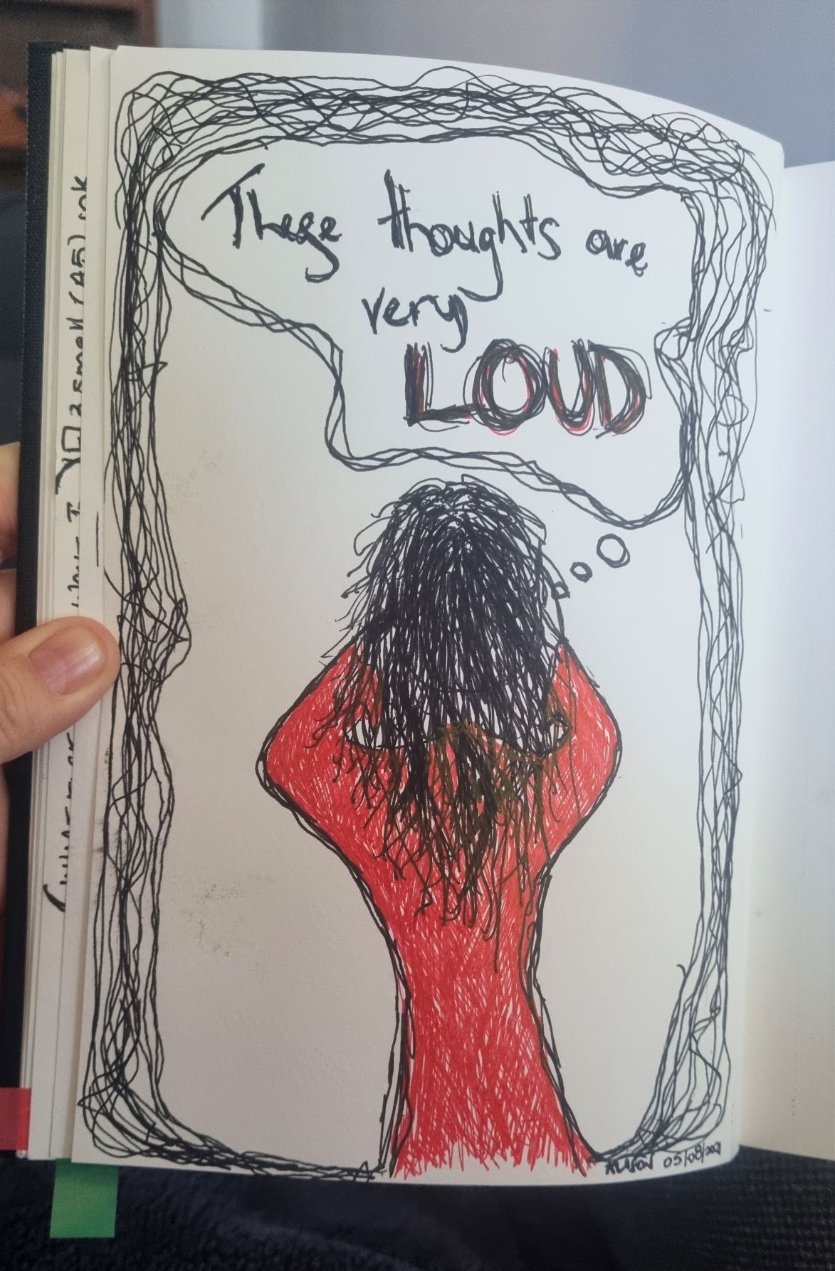 Turns out, I was not coping. Suddenly I found myself in the middle of a panic attack I could not control. I was supposed to do a presentation in class and those voices that kept telling me that I was a failure, an imposter, worthless, nobody liked me…they were so loud and overwhelming and the pain of listening to them so great that I could not keep it in anymore. I was drawing things like this…